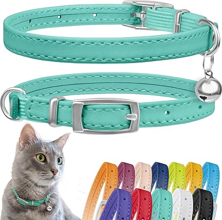CollarDirect Leather Cat Collar with Bell - Kitten Collar, Small and Big Cat Collar for Boy Cats, Girl Cats with Safety Elastic Strap (Neck Fit 8"-11", Mint Green)